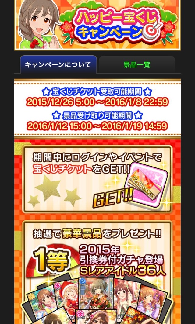 あいますっち: 【モバマス】ハッピー宝くじキャンペーン開催決定!1等は「2015年引換券付きガチャ登場SRアイドル36人」!