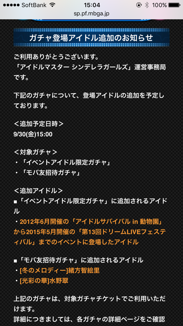 あいますっち: 【モバマス】「イベントアイドル限定ガチャ」「モバ友招待ガチャ」にアイドル追加のお知らせ(9月30日15時より)
