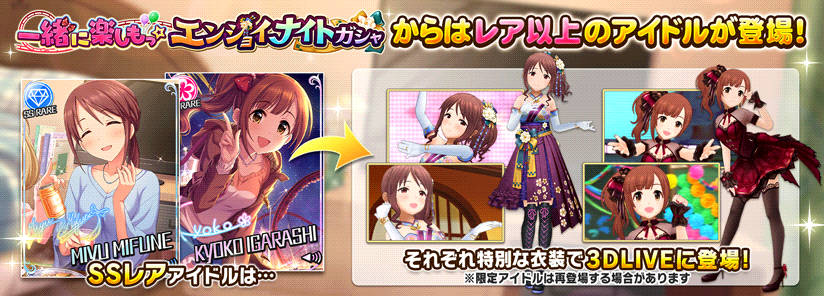 【デレステ】「一緒に楽しもっ☆エンジョイナイトガシャ」よりSSR三船美優・SSR五十嵐響子・SR姫川友紀・SR古澤頼子が登場!