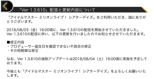 あいますっち: 【ミリシタ】シアターデイズVer.1.3.610が配信!