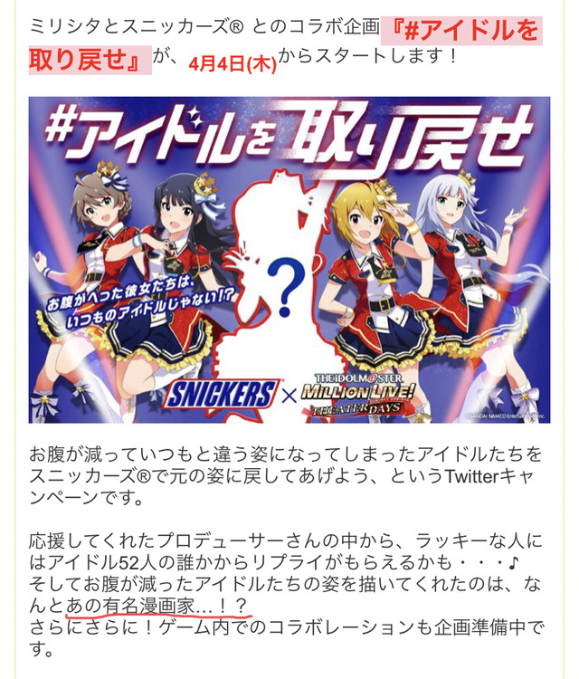 あいますっち: 【ミリシタ】スニッカーズ®とのコラボ企画『#アイドルを取り戻せ』キャンペーンが決定!ハラペコアイドルたちの姿を有名漫画家が描き下ろし!