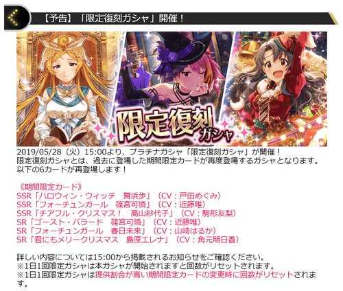 あいますっち: 【ミリシタ】本日15時から『限定復刻ガシャ』開催!歩、可憐、紗代子、未来、エレナのカードが再登場!