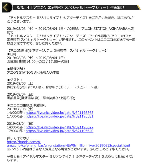 あいますっち: 【ミリマス】8/3、8/4に「アニON 姫君喫茶 スペシャルトークショー」生配信!各日14:00、17:00に開催。