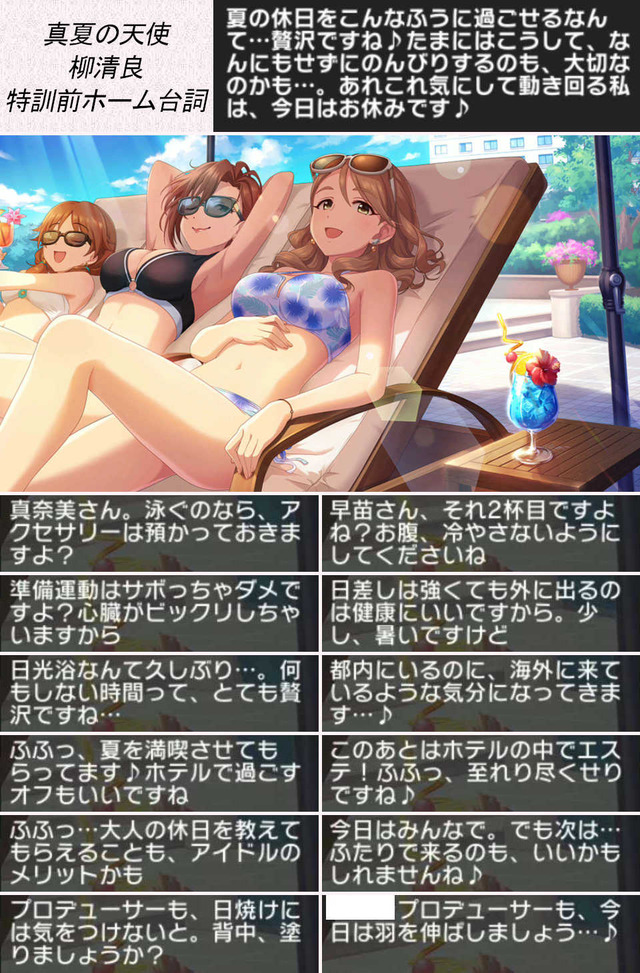 あいますっち: 【デレステ】[真夏の天使]柳清良「日光浴なんて久しぶり…。何もしない時間って、とても贅沢ですね…」
