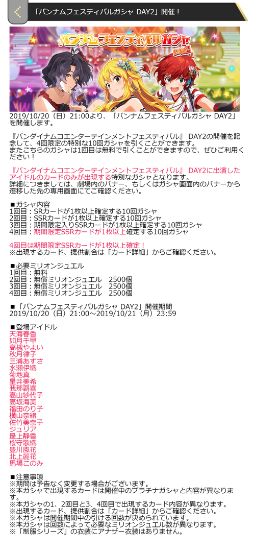 あいますっち: 【ミリシタ】4回限定『バンナムフェスティバルガシャ DAY2』開催!!1回目は無料、2回目以降も無償ミリオンジュエルで引ける!!+引いた結果