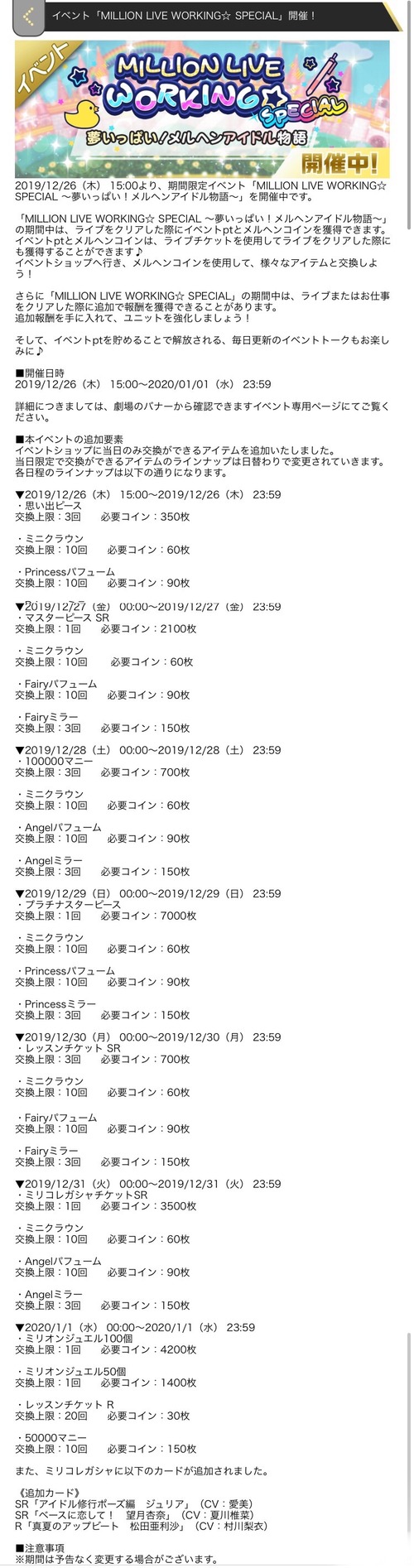 あいますっち: 【ミリシタ】イベント『MILLION LIVE WORKING☆ SPECIAL ~夢いっぱい!メルヘンアイドル物語~』開催!当日限定交換アイテム登場!&1月開催情報公開!