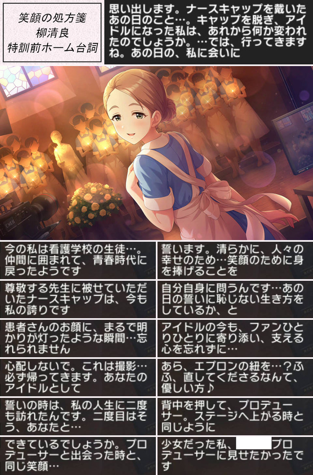 あいますっち: 【デレステ】[笑顔の処方箋]柳清良「思い出します。ナースキャップを頂いたあの日のことを・・・。キャップを脱ぎ、アイドルになった私は、あれから何か変われたのでしょうか。」