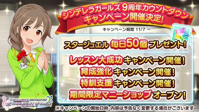 あいますっち: 【デレステ】シンデレラガールズ9周年カウントダウンキャンペーン開催決定!石が配られるゾオオオオオオオオオ!!!