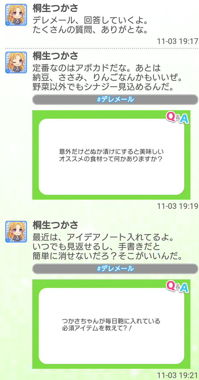 あいますっち: 【デレステ】桐生つかさのデレメールの返事。美味しいぬか漬けは納豆・ささみ・リンゴ。