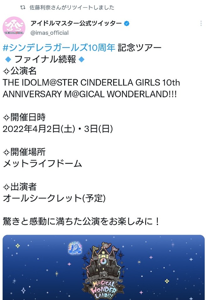 シンデレラ10th】ファイナル公演詳細決定!4月2日・3日!メットライフドーム!!!!おまえらー!!!西武ドームですよ!西武ドーム!!!つまり!!!!!!