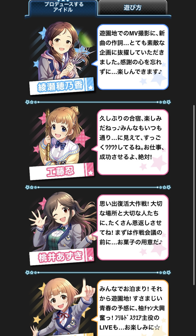 あいますっち: モバマス】ついにきた!フリルドスクエアのアイプロ!綾瀬穂乃香・喜多見柚・桃井あずき・工藤忍とお泊り遊園地デートだ!!